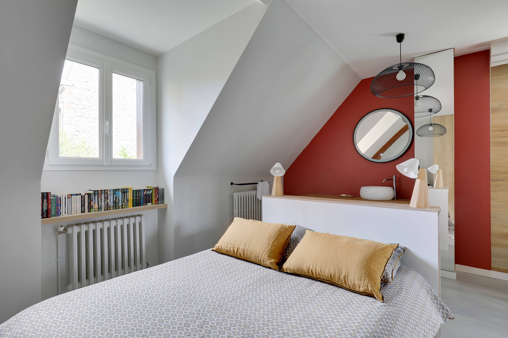 A l’étage, il y a les chambre des grands enfants. L’une avec un espace douche subtilement dissimulé derrière un retour de mur.  L’autre aura sa salle de bain. Les codes couleurs et les matières circulent également à l’étage, l’harmonie des teintes court dans l’ensemble de la maison.