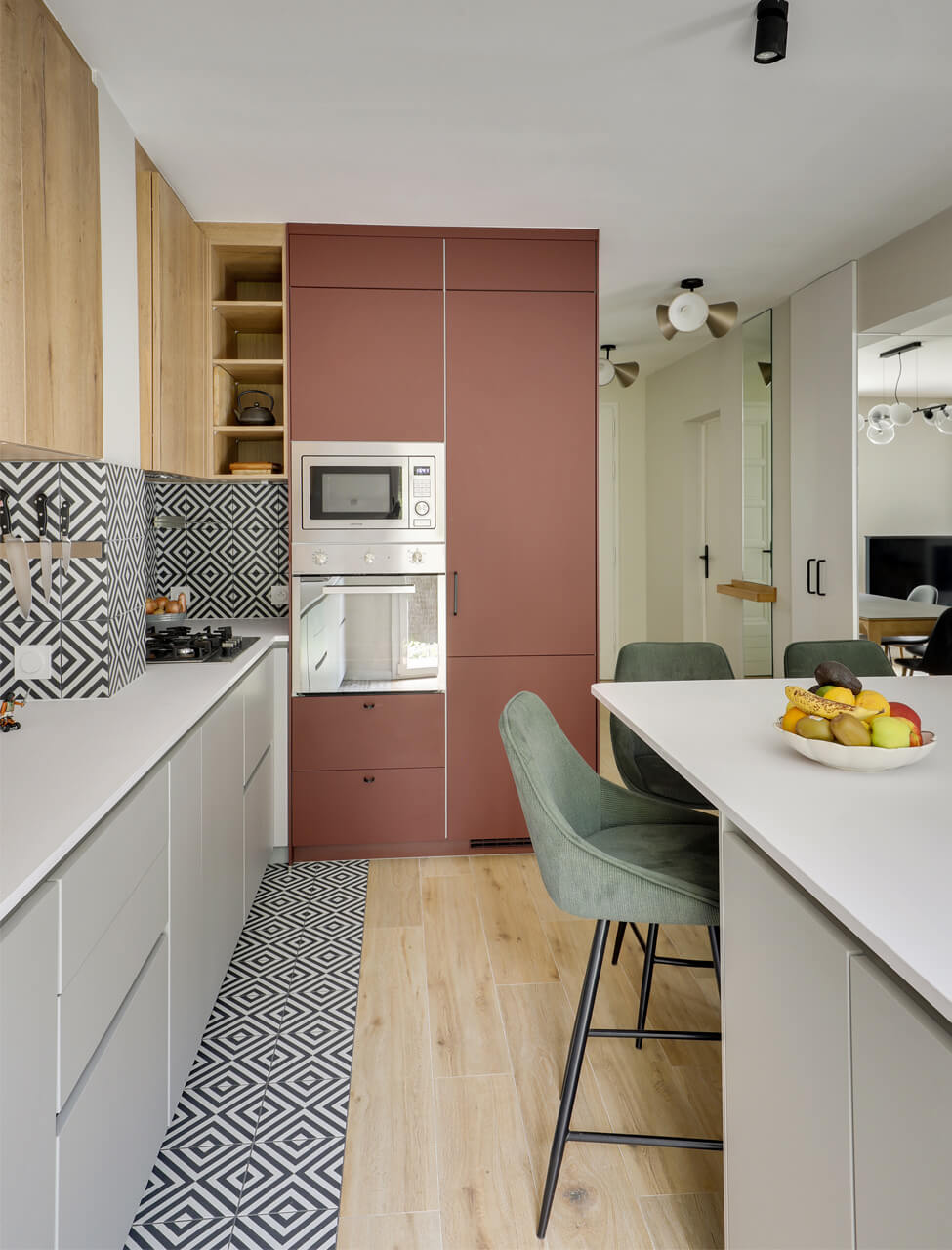 Pour profiter pleinement de la vue sur le jardin et la terrasse, la cuisine est changée de place et elle est ouverte sur le séjour. Pour cela, un mur porteur de 6m de long a été déposé.